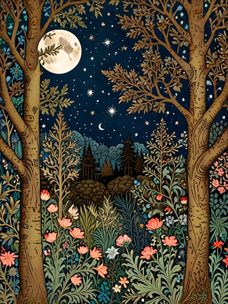 Under a luminous full moon and a sky sprinkled with stars, an enchanted forest comes alive. Ancient trees frame a hidden glade bursting with wildflowers and secret pathways. This intricate illustration whispers tales of folklore and magic, drawing viewers into a dreamy, moonlit world of timeless wonder.