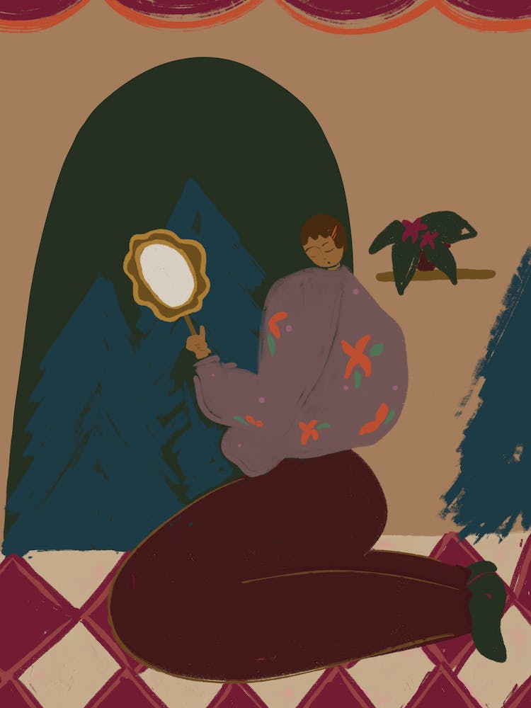 A figure sits in quiet contemplation, holding a small mirror to their face, a gentle invitation to inner discovery. Stylized mountains and foliage rise in the background, a serene landscape mirroring the journey within. This whimsical illustration, with its muted, earthy tones, evokes a sense of peace and introspective reflection.