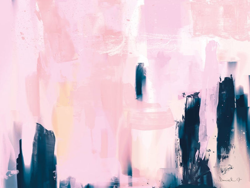 Broad, confident strokes of rosy pink and deep navy sweep across the canvas, punctuated by glints of soft white and pale yellow. The composition pulses with a vibrant energy, a dynamic interplay of color and movement. This abstract piece feels both soft and strong, a contemporary statement of bold beauty.