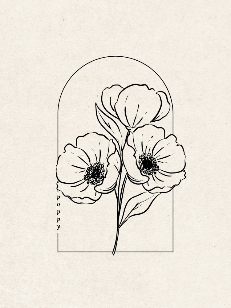 Three delicate poppy flowers emerge within a graceful arched frame, rendered in crisp, minimalist line art. The clean lines against a creamy background create an atmosphere of serene simplicity and understated elegance. It captures the quiet strength and enduring beauty of nature with refined precision.