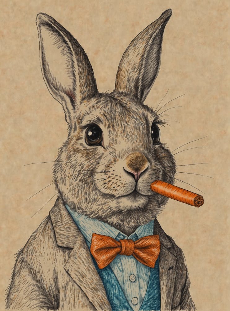 A dapper rabbit, impeccably dressed in a suit and bow tie, calmly puffs on a cigar. The fine crosshatch lines give it a classic, whimsical feel, suggesting a character from a forgotten fable. This curious portrait exudes an air of quiet confidence and a touch of sophisticated mischief, inviting a smile.