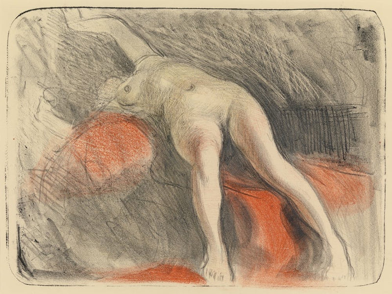 A figure reclines with a graceful curve, rendered with sensitive lines and soft shadows, resting upon a field of rich red. The artwork, by Magnus Enckell, captures a timeless intimacy and contemplative mood through masterful draftsmanship. It's a profound study of the human form, both delicate and powerful.
