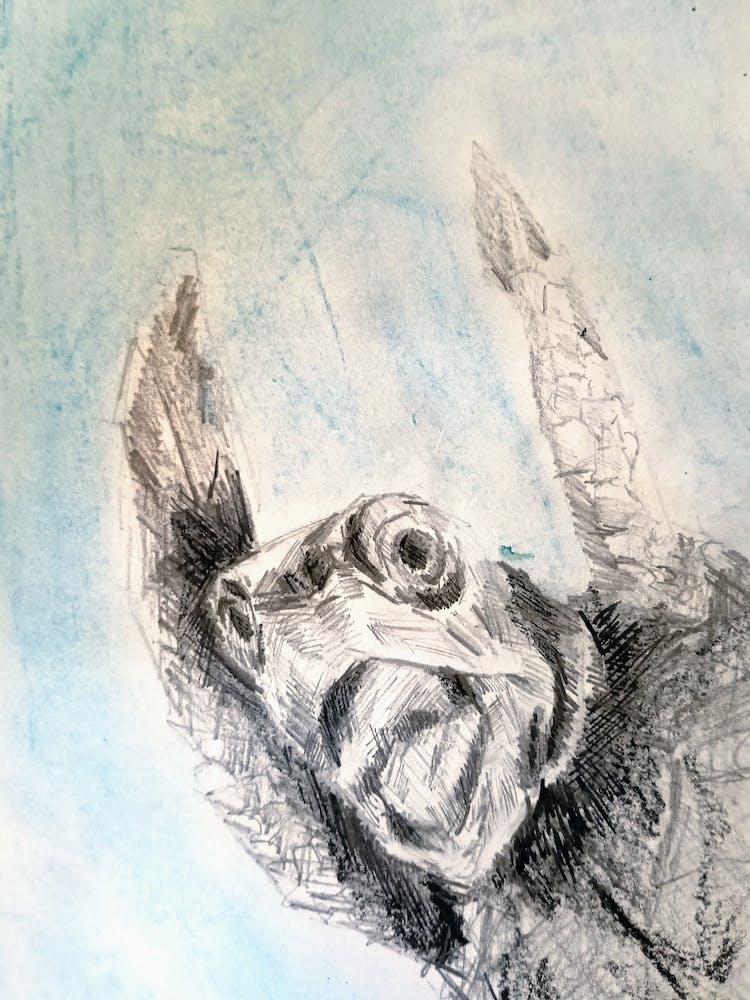 A turtle's head emerges from a watery realm, its form rendered in energetic pencil strokes. Dark shading gives way to raw paper, hinting at untold depths. The cool wash of blue suggests a vast, tranquil ocean, yet the creature's gaze holds a primal, silent intensity.
