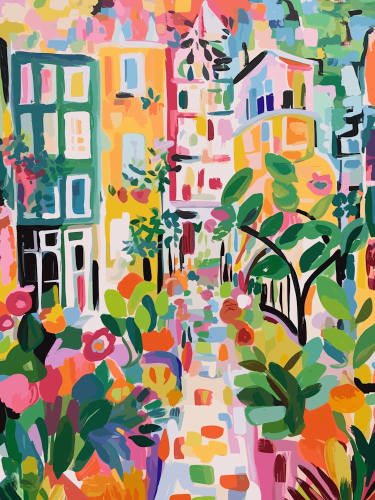 A vibrant tapestry of saturated hues—pinks, greens, yellows, and blues—swirls together, forming an abstracted, sun-drenched European village. Energetic brushstrokes create a pulsating texture, evoking the joyful chaos and warmth of a summer day. This piece radiates pure, unadulterated cheer, a lively celebration of color and light.