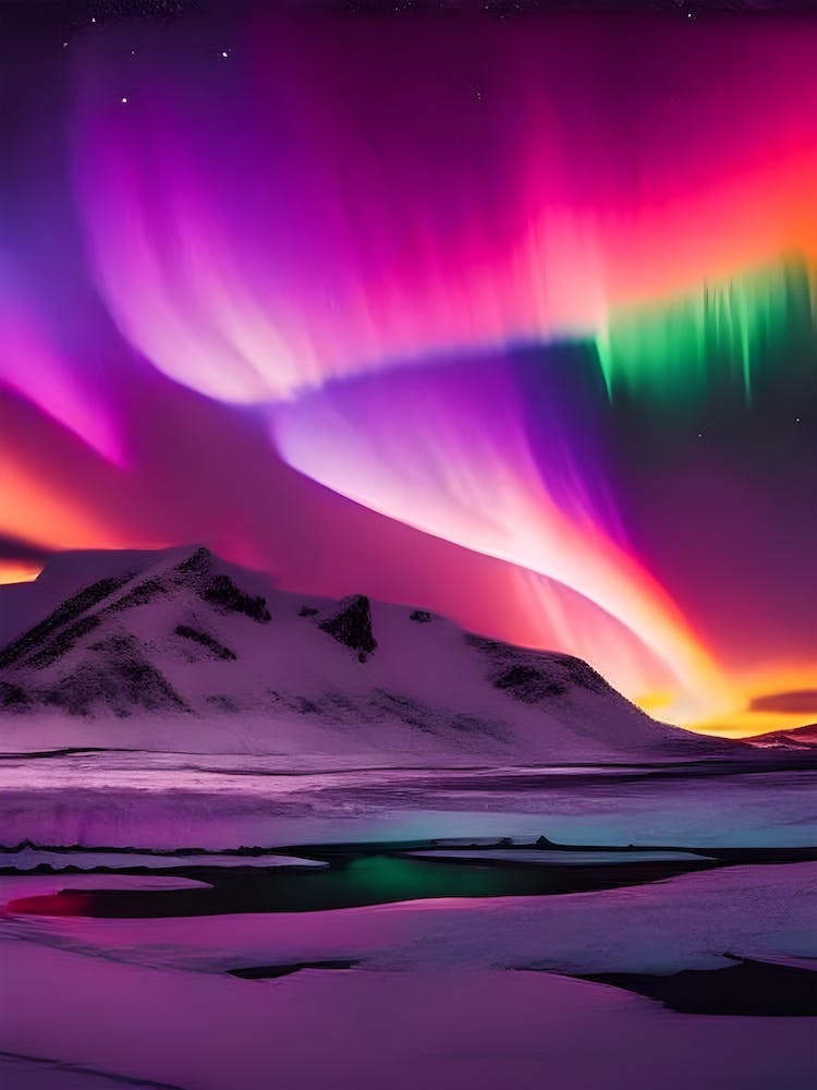 Vibrant ribbons of fuchsia, emerald, and violet unfurl across a star-dusted night, bathing snow-capped peaks in an ethereal glow. This celestial dance captures the raw majesty of the aurora, a dramatic interplay of light and shadow over a frozen landscape, evoking wonder and boundless energy.