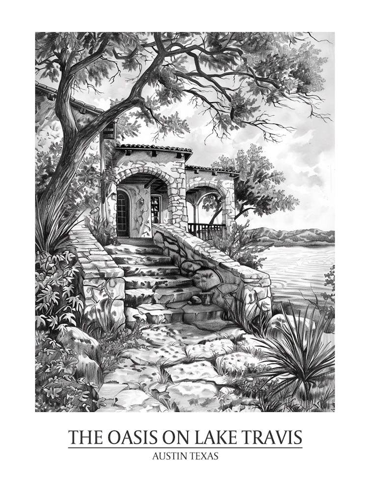 The Oasis On Lake Travis Austin Texas Black And White Drawing 4 Poster