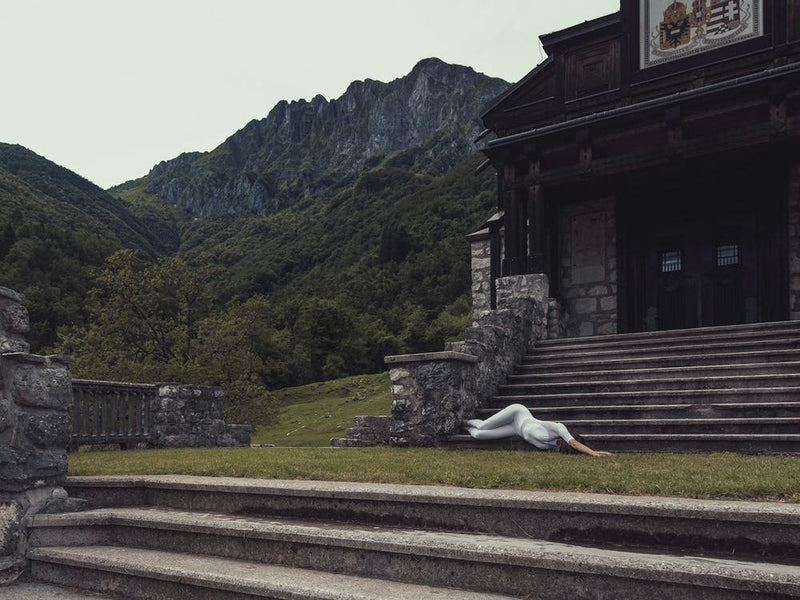 A solitary figure in a graceful yoga pose lies on stone steps before a rugged mountain backdrop and an ancient building. The muted tones and stark lines create a contemplative mood, suggesting a union of mind, body, and nature amidst human-made structures. It's a powerful image of peace found in unexpected places.