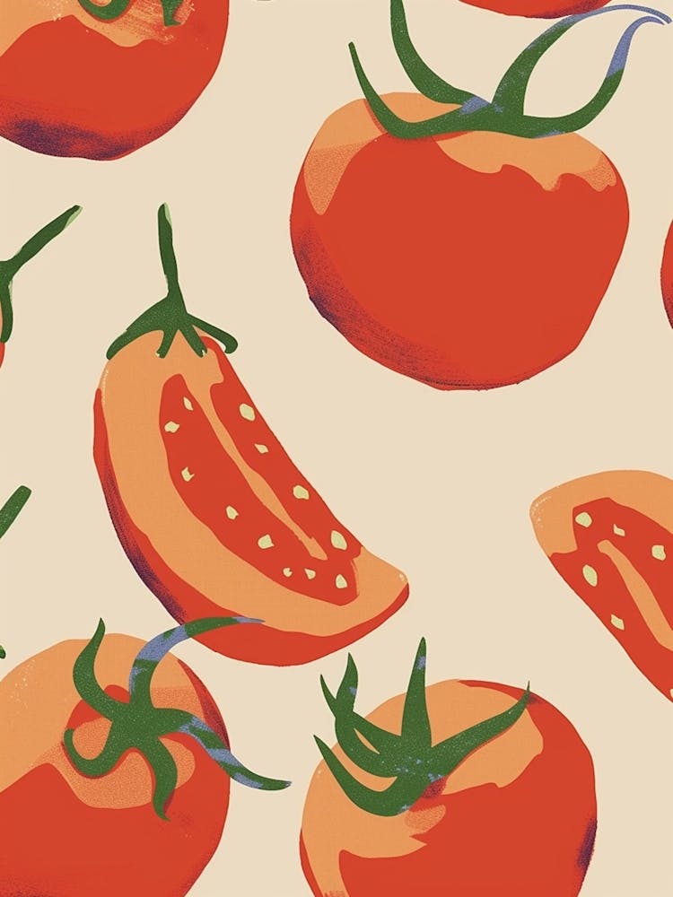 Juicy red and orange tomatoes, some whole, some sliced, tumble across a cream background in a vibrant, repeatable pattern. Green stems and leaves add fresh accents to the bold, illustrative style. This cheerful motif captures the rustic charm and simple abundance of a summer harvest, perfect for a kitchen setting.