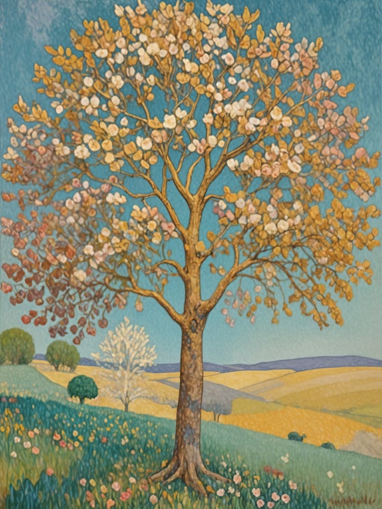 A majestic tree, adorned with delicate white and yellow blossoms, stands sentinel over a rolling, wildflower-strewn landscape. The sky is a soft, muted blue, casting a serene glow over the pastoral scene. This illustration evokes a sense of timeless peace and natural harmony, like a gentle breath of spring captured in a dream.