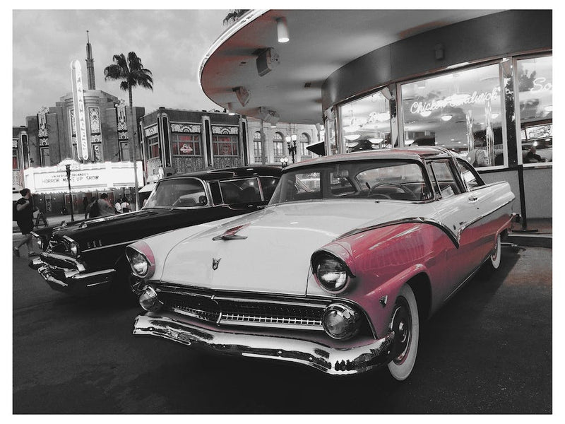 A gleaming pink vintage car, a beacon of 1950s Americana, idles by a classic diner. The image, selectively colorized against a monochrome backdrop, captures a timeless slice of roadside nostalgia. It's a visual journey back to an era of rock'n'roll and open roads.