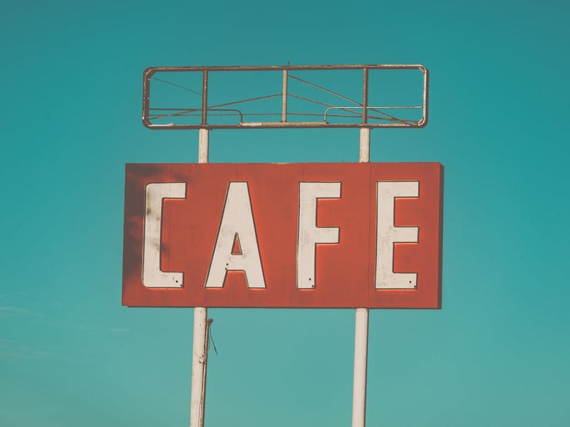 A solitary red 'CAFE' sign, weathered by sun and time, stands stark against an expansive turquoise sky. The image evokes the quiet allure of bygone desert journeys and forgotten roadside stops. It’s a nostalgic postcard from a simpler era, hinting at untold stories along an endless highway.
