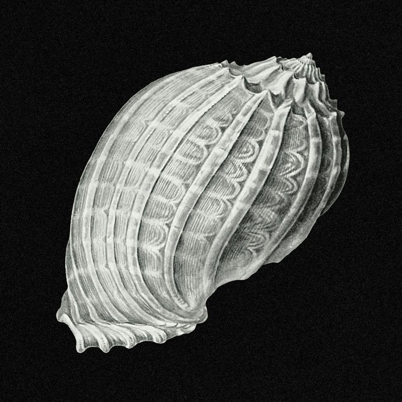 A vintage shell illustration unfurls delicate ridges against a stark black void. Each line, a testament to nature's intricate geometry, speaks of deep ocean mysteries and timeless elegance. The monochrome palette accentuates its scientific beauty, inviting quiet contemplation.