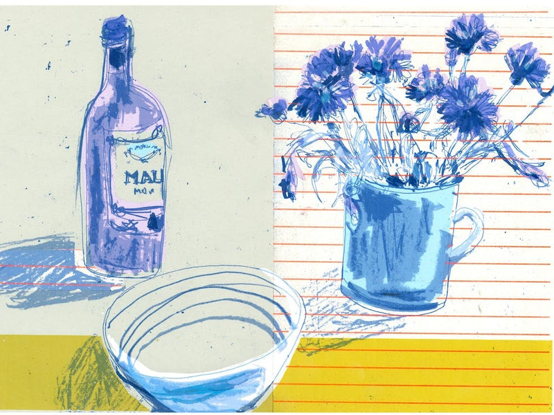 A vibrant, impressionistic sketch captures the simple pleasure of wine and flowers. A cobalt bottle and a mug overflowing with blue blooms sit beside a clear glass, all rendered in playful, energetic lines and bright hues. It evokes a relaxed, cheerful moment, a celebration of everyday beauty.