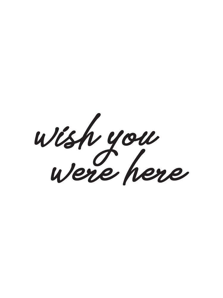 The poignant phrase 'wish you were here' is rendered in elegant, flowing script on a crisp white background. Its minimalist presentation highlights the deeply human sentiment, evoking a sense of longing, connection, or a gentle nostalgia for shared moments and cherished presences.